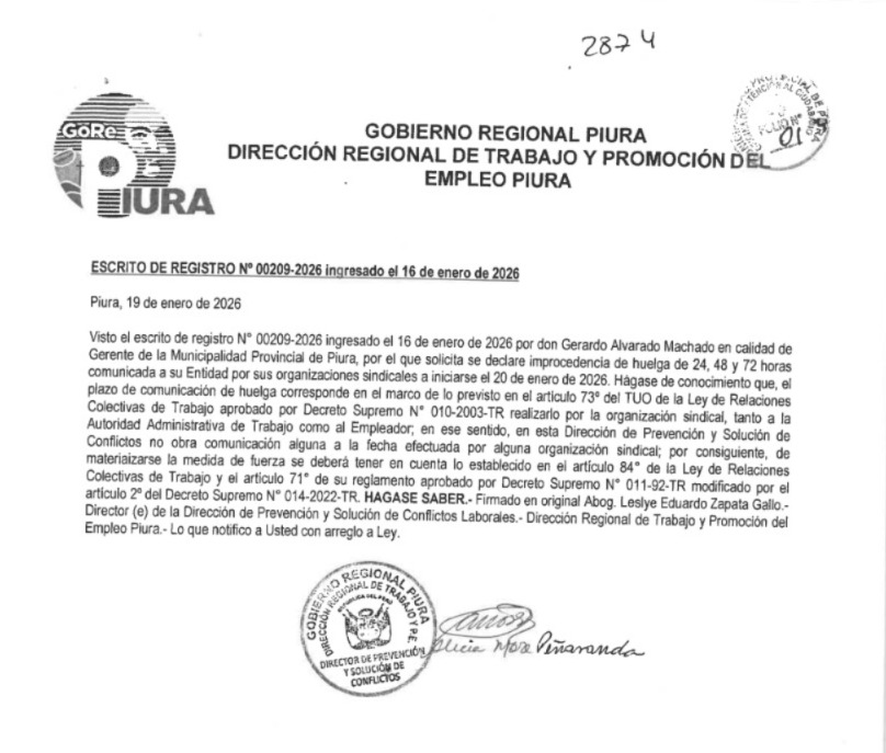 La Municipalidad Provincial de Piura informó que la Dirección de Prevención y Solución de Conflictos Laborales declaró improcedente la huelga de veinticuatro, cuarenta y ocho y setenta y dos horas que había sido anunciada para iniciar el veinte de enero de dos mil veintiséis, al no cumplirse con los requisitos legales establecidos en la normativa vigente.