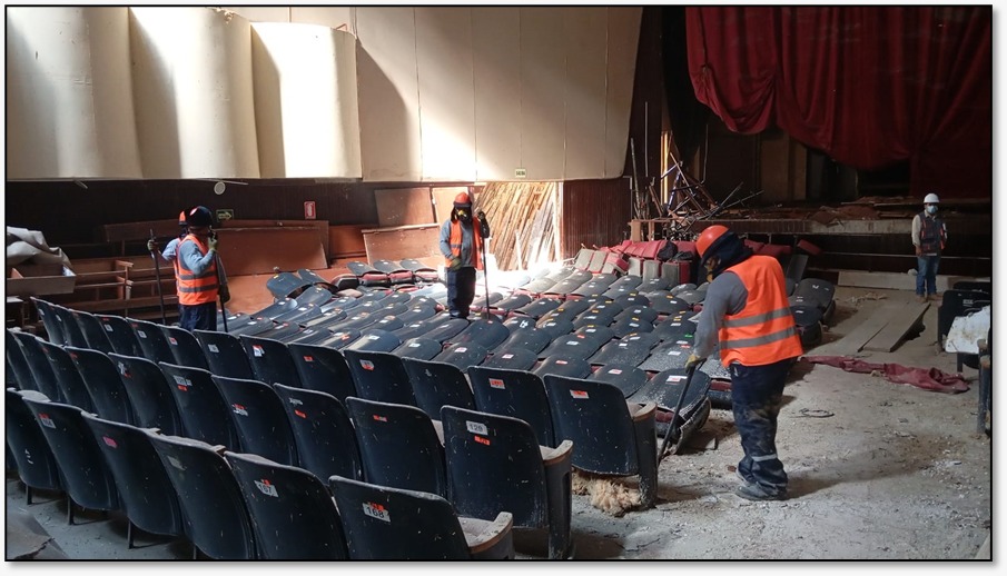El ingeniero Yefraín Sánchez Nizama, subgerente de Obras de la Municipalidad de Piura, detalló que la obra se encuentra actualmente en la etapa de contingencia, que incluye la movilización de equipos y el desmontaje de las butacas del antiguo teatro.}