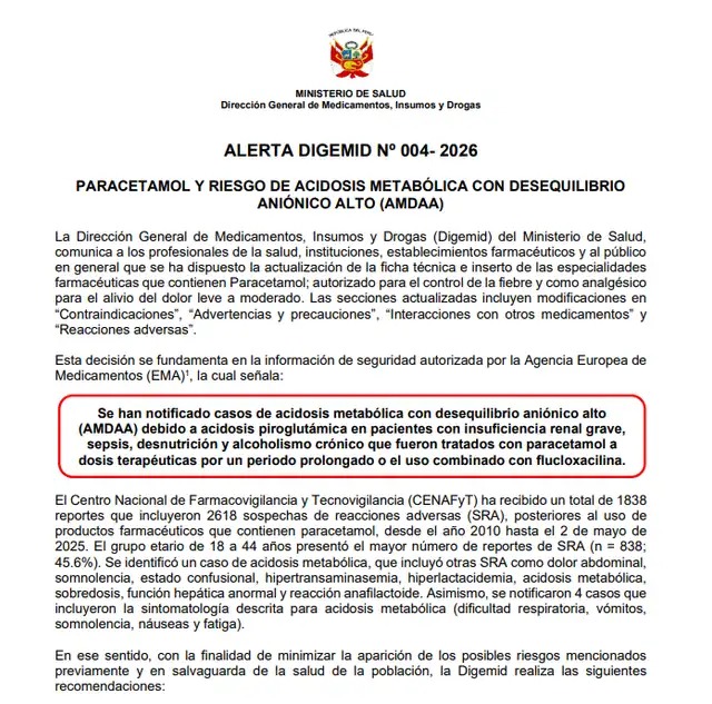 La Dirección General de Medicamentos, Insumos y Drogas (Digemid) emitió la alerta sanitaria N.º 004-2026 por el uso del paracetamol, luego de recibir más de 2.600 reportes de posibles reacciones adversas asociadas a este medicamento entre los años 2010 y 2025.