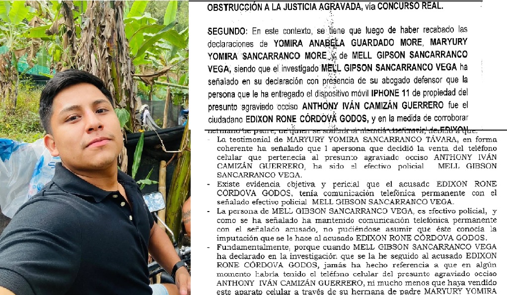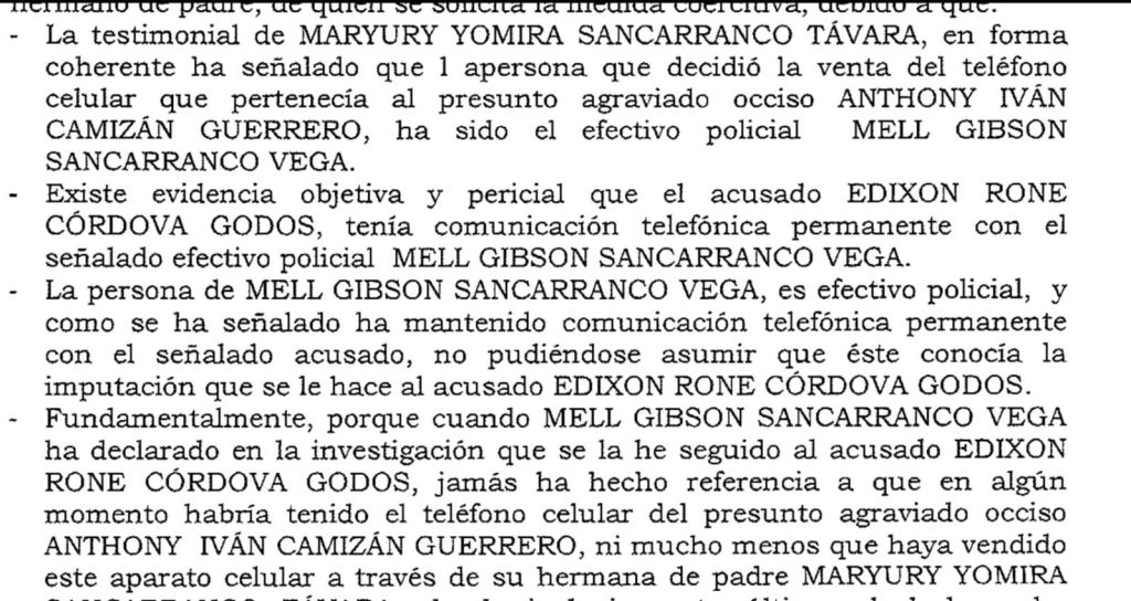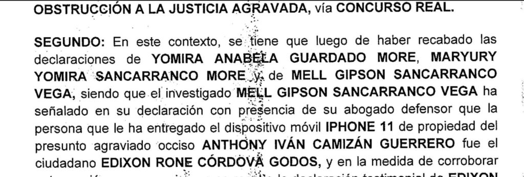 De acuerdo con el documento fiscal que sustenta la investigación por el presunto delito de obstrucción a la justicia vía concurso real, Mell Gipson Sancarranco Vega declaró que fue Edixon Rone Córdova Godos quien le entregó el teléfono de propiedad de Anthony Camizán.