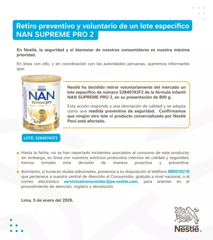 El Instituto Nacional de Defensa de la Competencia y de la Protección de la Propiedad Intelectual (Indecopi) informó el retiro preventivo del mercado peruano de la fórmula infantil NAN Supreme Pro 2, debido a un posible riesgo para la salud asociado a una eventual contaminación bacteriana.