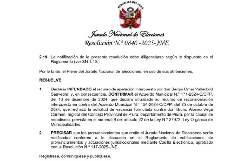 El Jurado Nacional de Elecciones (JNE) confirmó la decisión del Concejo Provincial de Piura y declaró infundado el recurso de apelación presentado contra el rechazo de la vacancia del regidor Bruno Alonso Vega Carmen, por la causal de nepotismo. Con este fallo definitivo, el concejal continúa en el cargo.