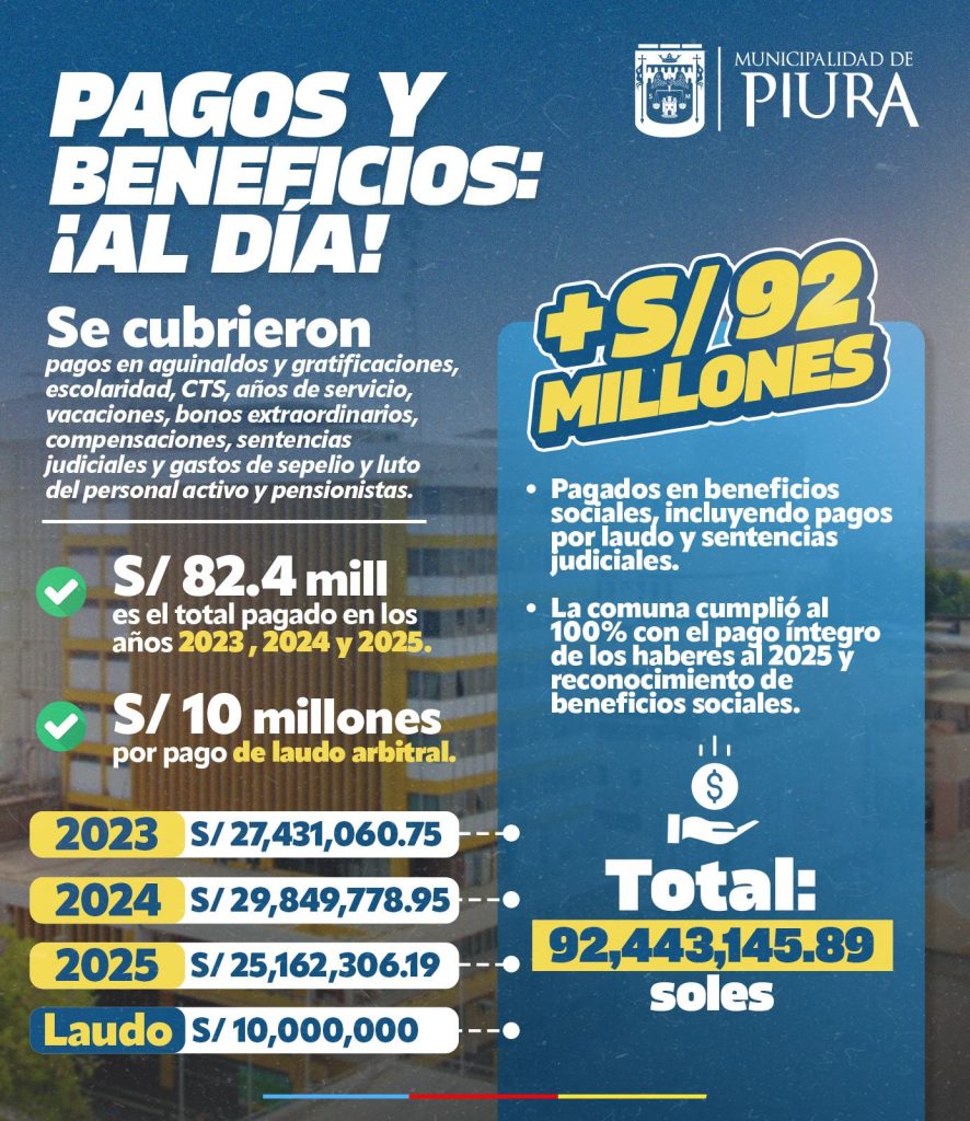 Entre los años 2023, 2024 y 2025, la comuna piurana ejecutó pagos por S/ 82.4 millones en beneficios sociales, que comprenden aguinaldos y gratificaciones, bonificación por escolaridad, Compensación por Tiempo de Servicios (CTS), asignaciones por cumplir 25 y 30 años de servicio, bonificaciones vacacionales, bonos extraordinarios, compensaciones vacacionales, así como sentencias judiciales y gastos de sepelio y luto del personal activo y pensionistas. A este monto se suma el cumplimiento de pagos derivados de laudos, superando los S/ 92 millones en desembolsos totales.