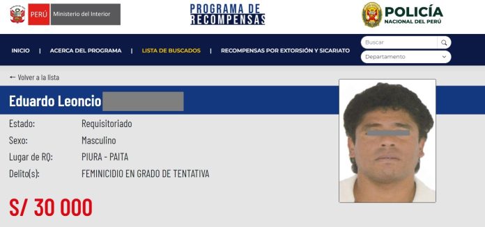 Agentes de la comisaría PNP Ciudad del Pescador, perteneciente a la Región Policial Piura, intervinieron a un sujeto que presentaba orden de captura por el delito de feminicidio en grado de tentativa, y figuraba entre los más buscados del Programa de Recompensas del Ministerio del Interior, por el cual ofrecían un beneficio económico de S/ 30,000.
