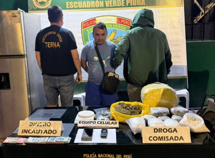 En acciones para combatir el tráfico ilícito de drogas, agentes del Escuadrón Verde PNP Piura, perteneciente a la Región Policial Piura, intervinieron a un presunto integrante de la banda delictiva “Los Lobos del Norte”, en poder de gran cantidad de droga. El hecho se registró la noche de ayer, en la Upis El Condado, distrito de Veintiséis de Octubre – Piura.