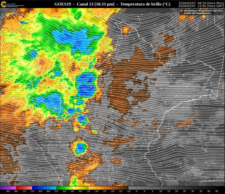 Una imagen satelital registrada a las 08:50 a. m. muestra la presencia de núcleos convectivos importantes sobre los departamentos de Piura y Tumbes, lo que indica el desplazamiento de un sistema convectivo activo en la zona norte del país.