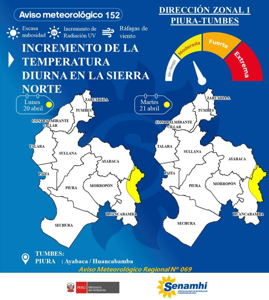 El Servicio Nacional de Meteorología e Hidrología del Perú, a través de su Dirección Zonal 01, emitió el Aviso Meteorológico Regional N.º 069, en el que advierte sobre el incremento de la temperatura diurna en la sierra norte del país.