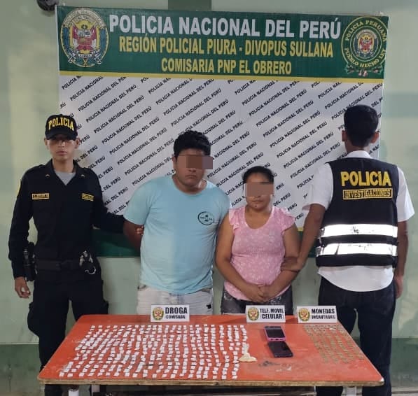 Posteriormente, los efectivos se desplazaron hasta la calle Vichayal con av. Cayetano del asentamiento humano Santa Teresita – Sullana, logrando la detención de Cristhian Marlon C. R. (30) y Rosmery Carolina A.CH. (29), presuntos integrantes de la banda delictiva “Los Delivey de la San Luis”. Se les decomisó 328 ketes de PBC e incautó la mototaxi de placa de rodaje 42378B, en la que se movilizaban.