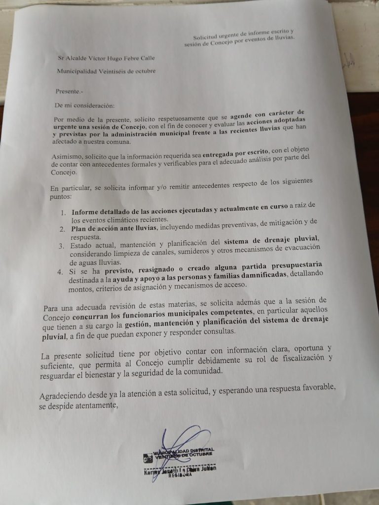 Luego de que diversos sectores del distrito Veintiséis de Octubre permanezcan inundados a causa de las lluvias, la regidora Karina La Chira denunció el abandono de puestos de trabajo por parte de funcionarios de la Municipalidad Distrital, situación que habría dejado sin atención a los vecinos en un contexto de emergencia.